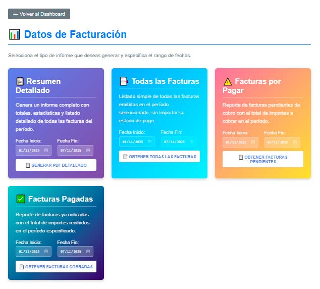 • Informes de proveedores individual o conjuntamente. Filtro por fechas. Obtén trimestres. Anuales.